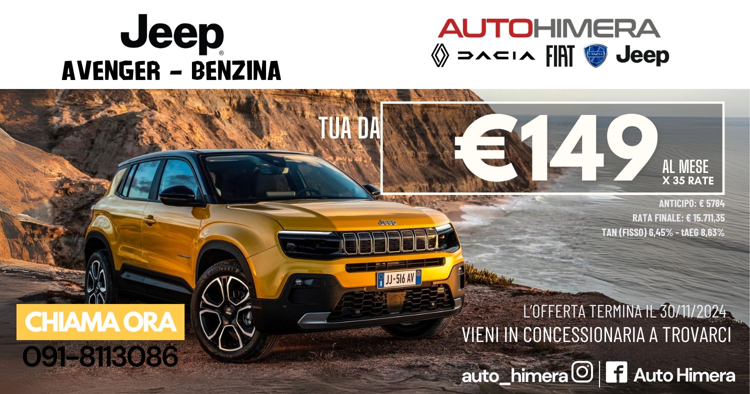 Promozione Jeep Avenger Dicembre: la tua nuova Jeep a €149 al mese! – Scopri l’incredibile offerta di Auto Himera per questo dicembre! La Jeep Avenger a benzina può essere tua a soli €149 al mese per 35 rate. Non perdere questa occasione straordinaria!